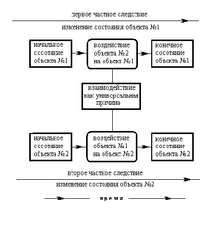 Поскольку взаимодействие составляет основу причинности, рассмотрим взаимодействие двух материальных объектов, схема которого приведена на рис. 1. Данный пример не нарушает общ-ности рассуждений, поскольку взаимодействие нескольких объектов сводится к парным взаи-модействиям и может быть рассмотрено аналогичным способом.